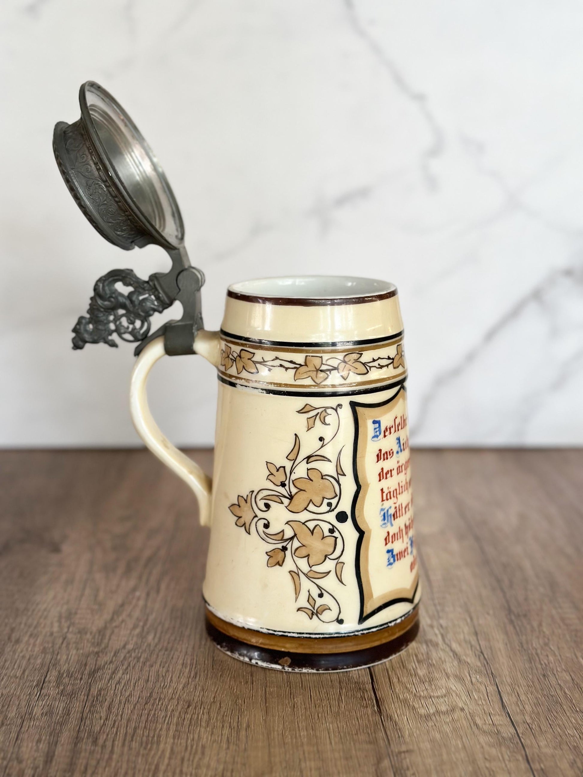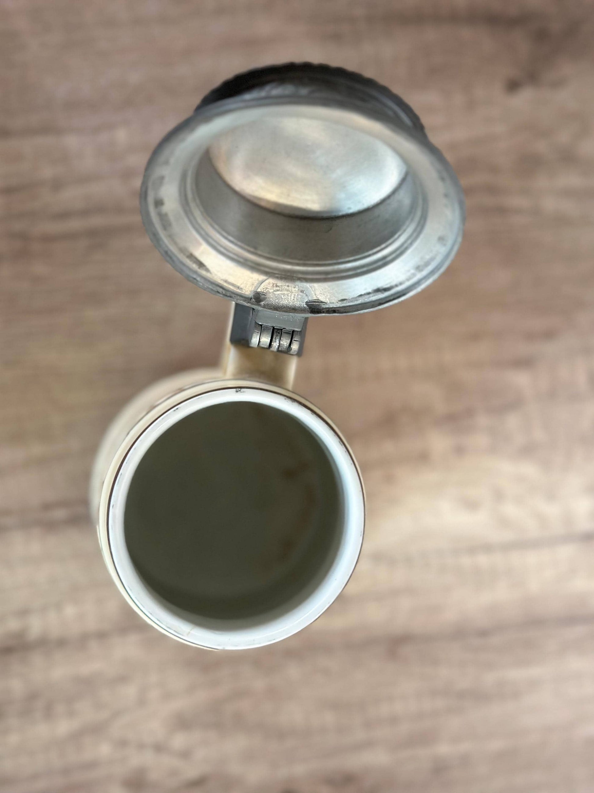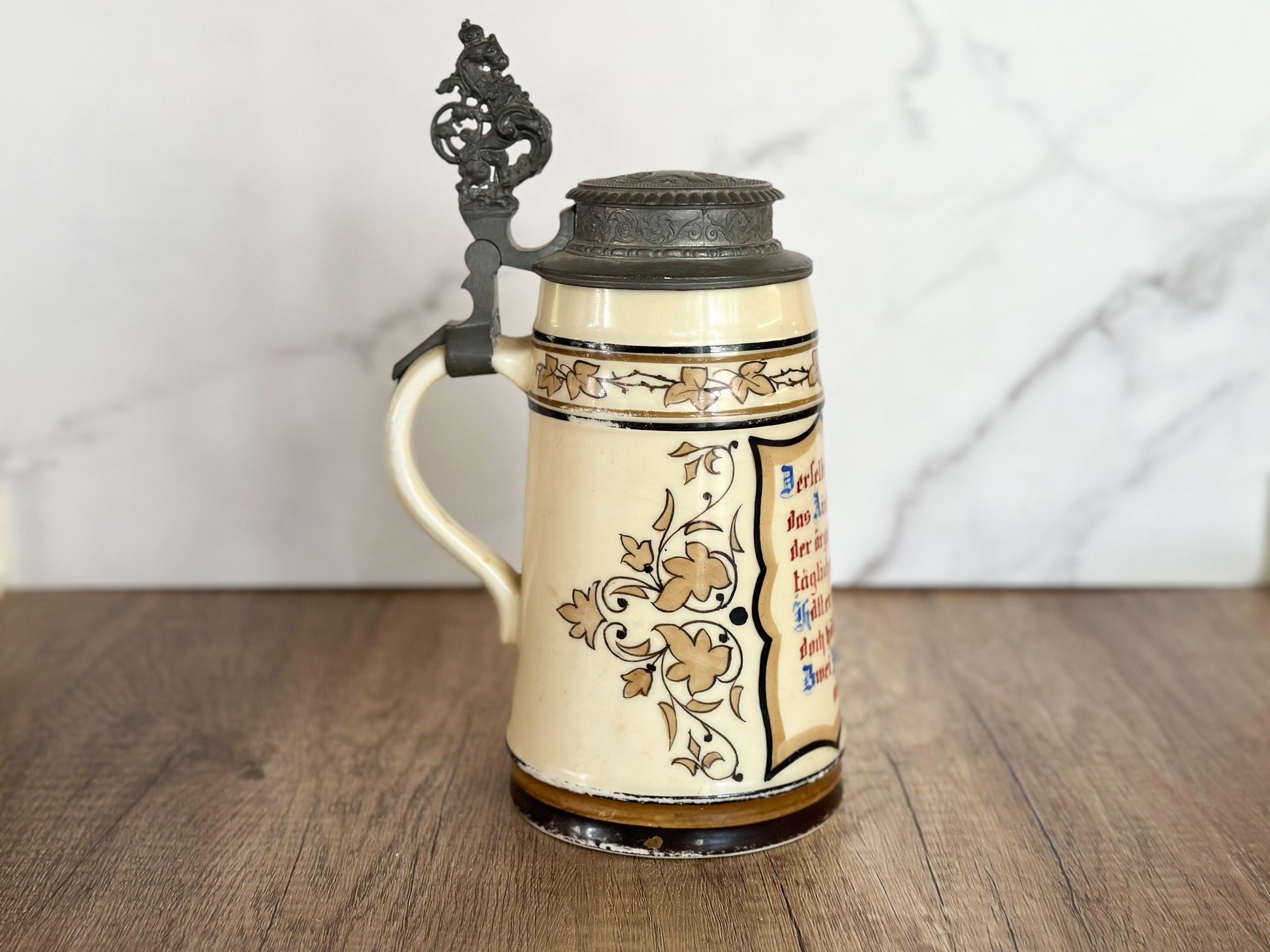 Vintage German beer stein with pewter lid. Measures about 10.25” tall.