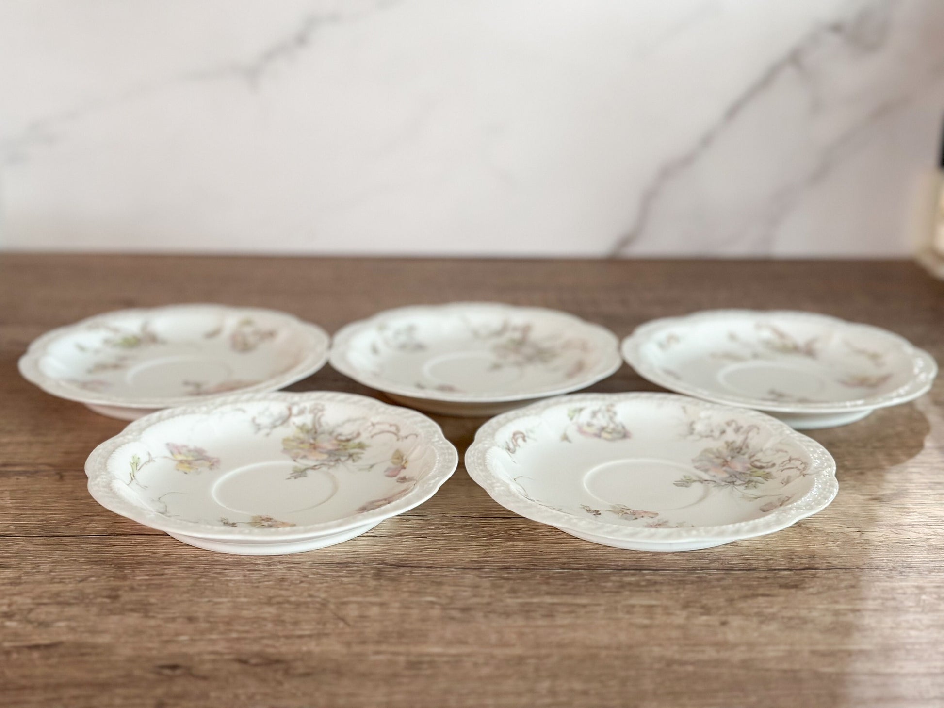 Beautiful set of 5 Haviland & Co. Limoges floral saucers. Each saucer measures about 5.5” diameter.