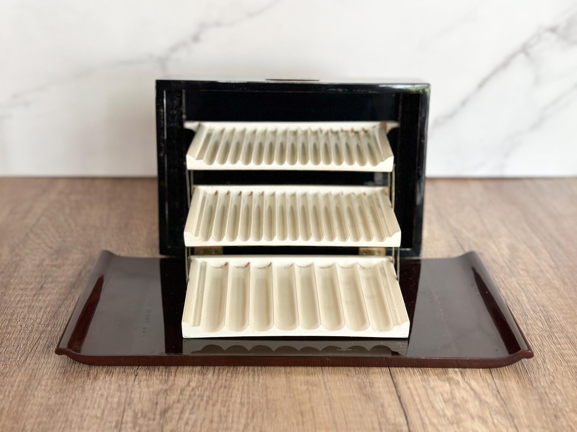 Vintage Japanese lacquered cigar/cigarette box with engraving. Measures about 5.5” tall and 11” long.