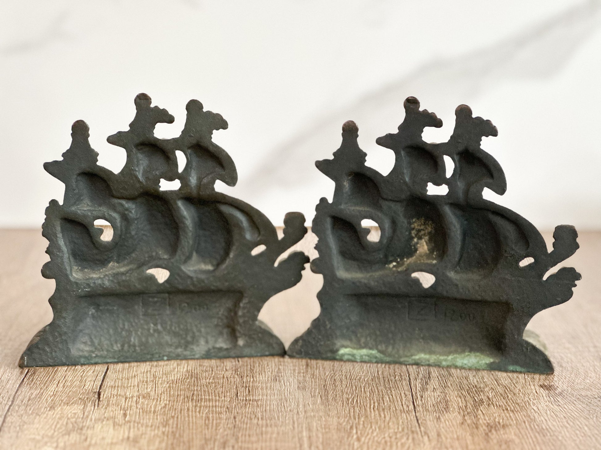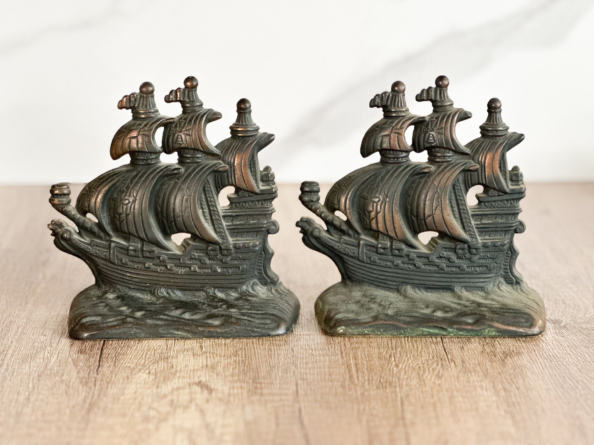 Handsome set of vintage Spanish ship bookends. Each measures about 5.5” by 6.5”.