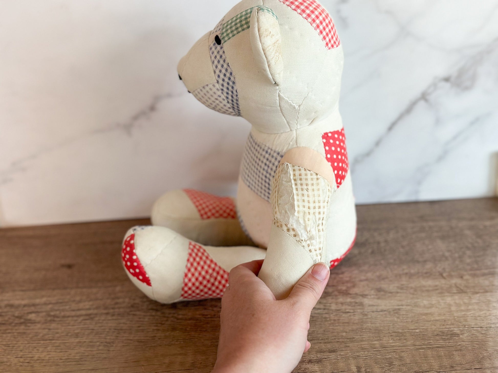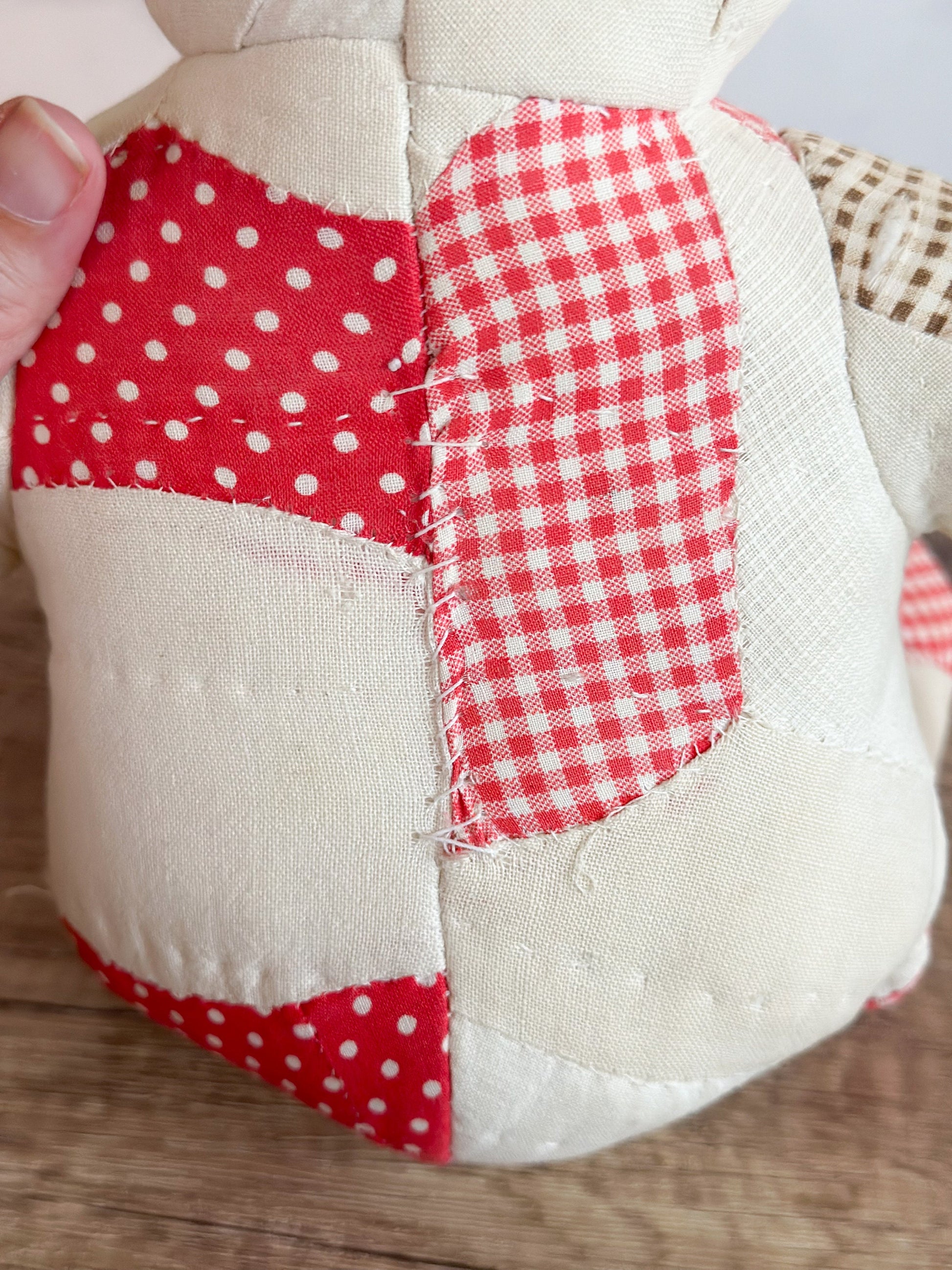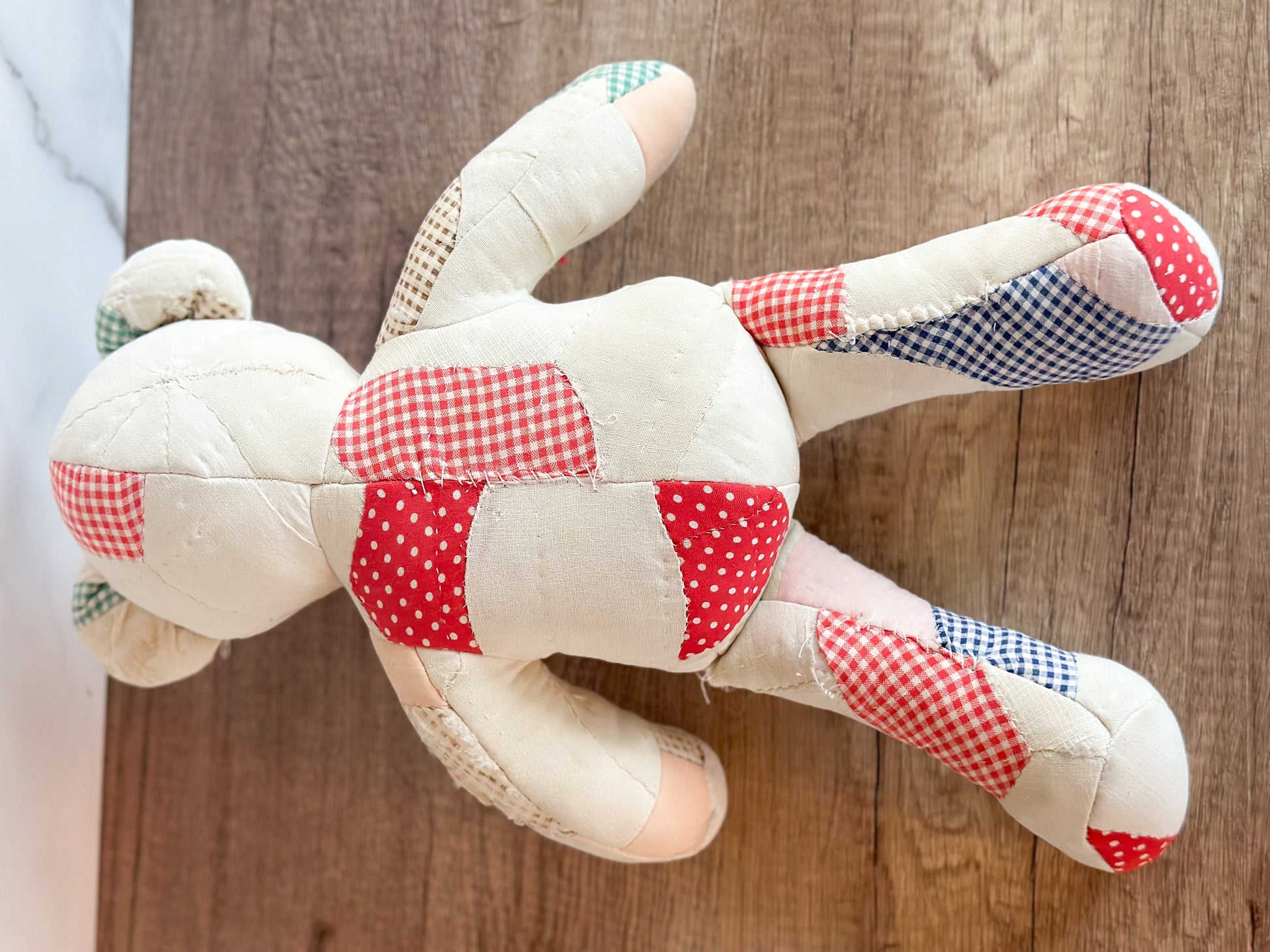 Adorable vintage patchwork teddy bear. Some wear and tear, as shown. Measures about 16.5” tall standing, 11” tall sitting.