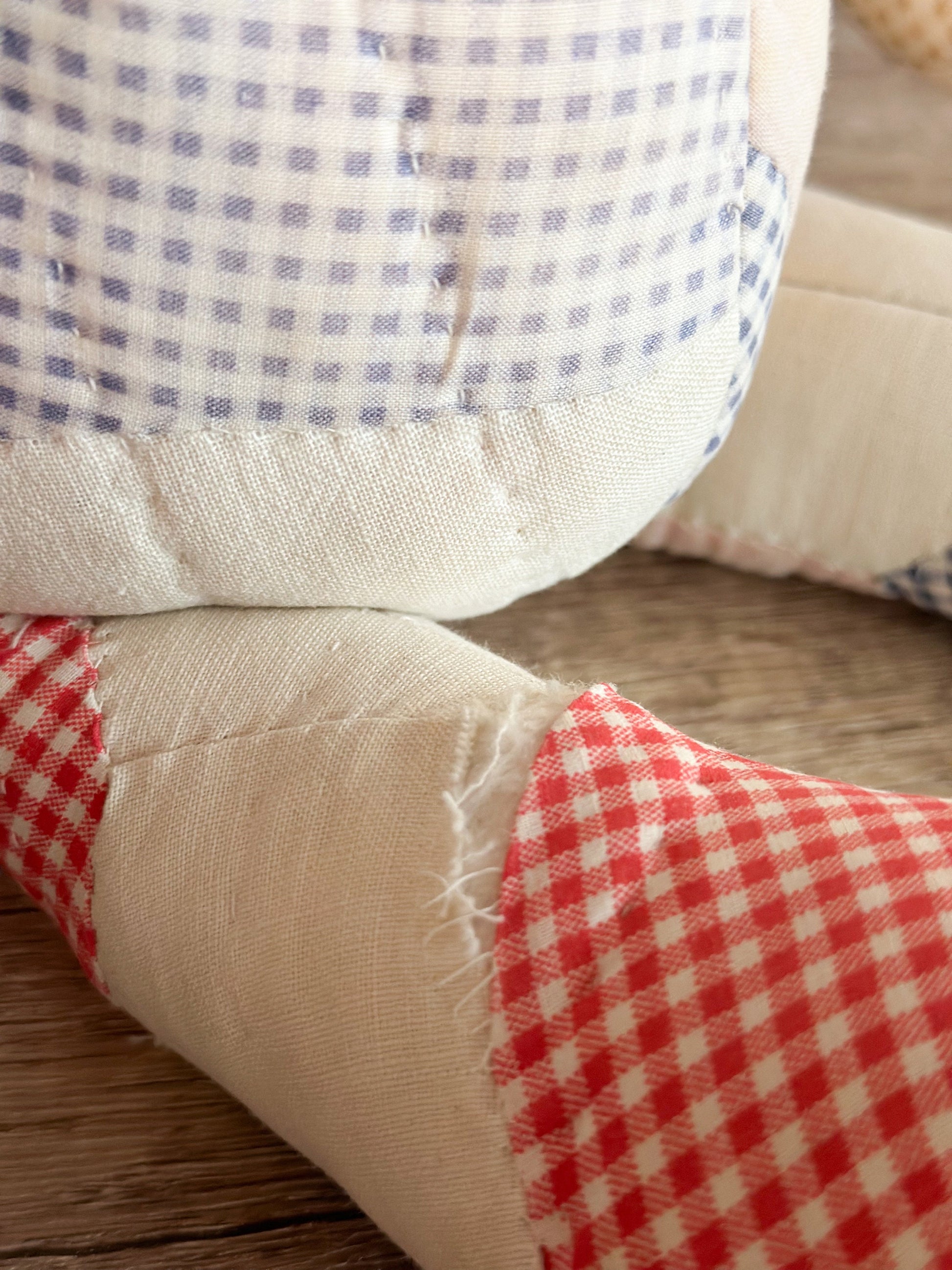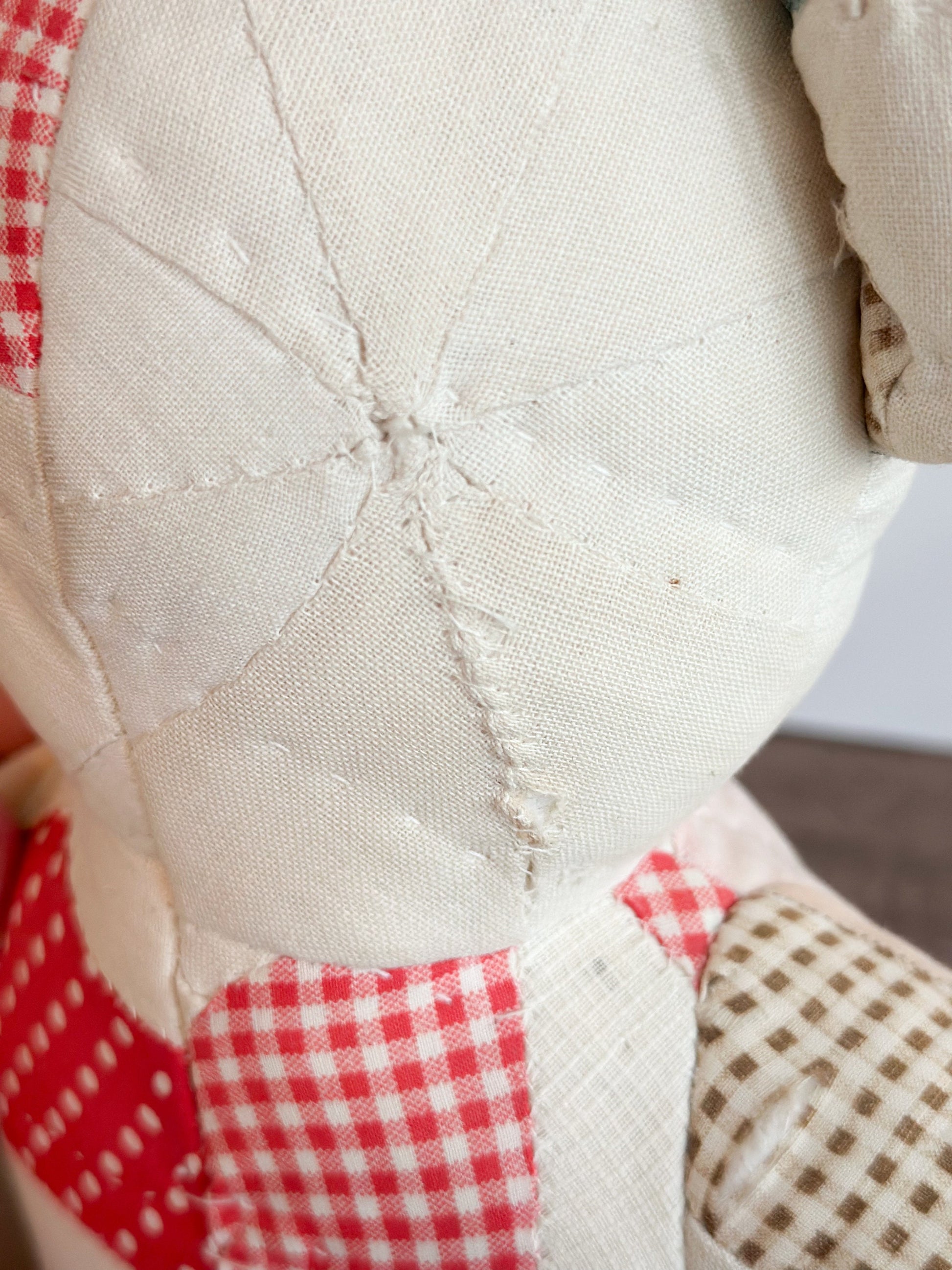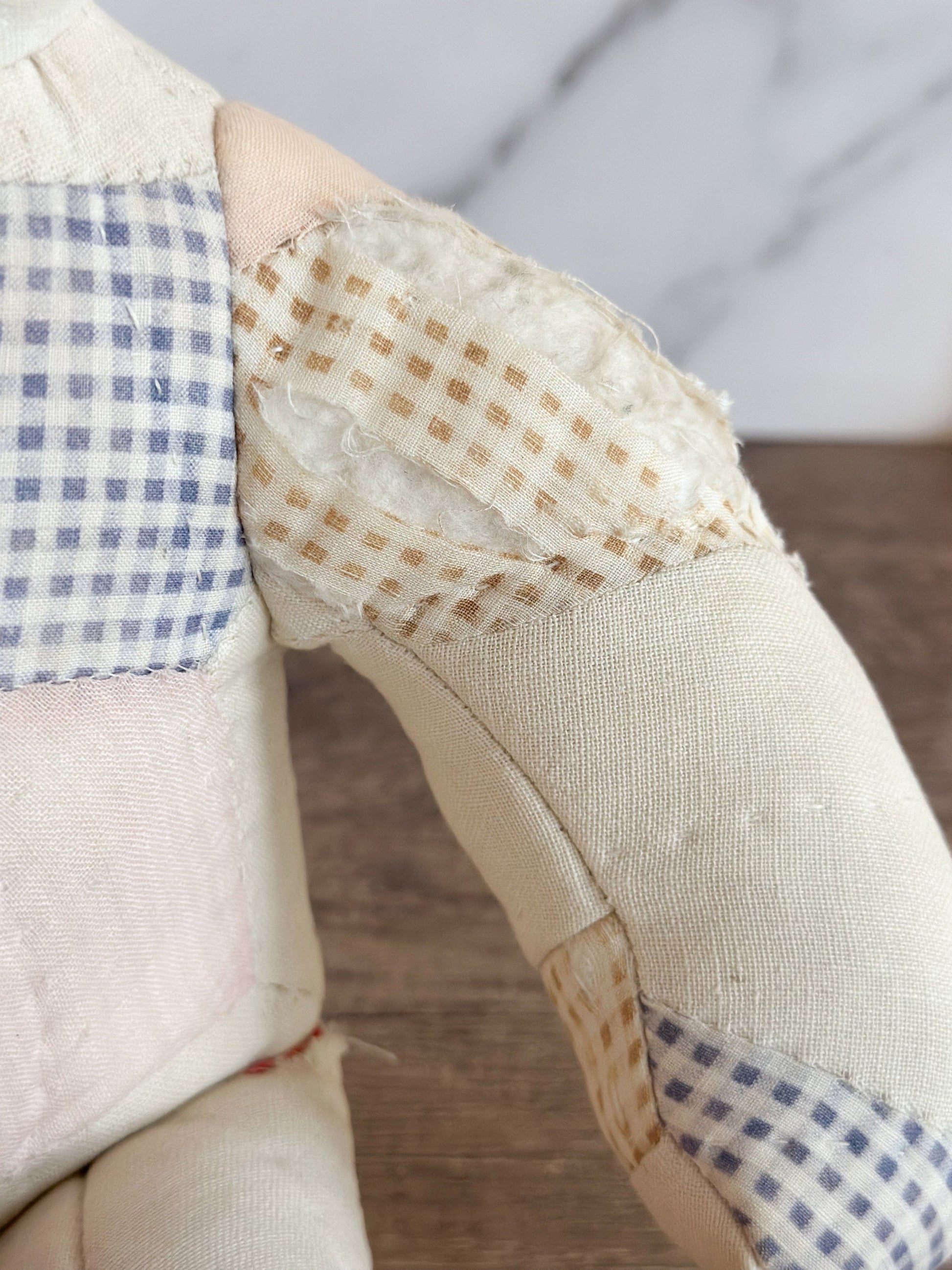 Adorable vintage patchwork teddy bear. Some wear and tear, as shown. Measures about 16.5” tall standing, 11” tall sitting.