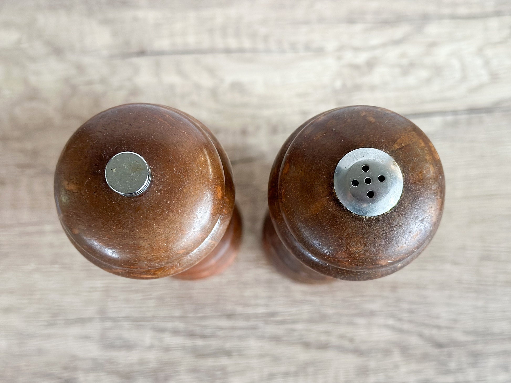 Tall wooden salt and pepper shakers. Some wear on one of the shakers, as shown. Each measures about 9.5” tall.