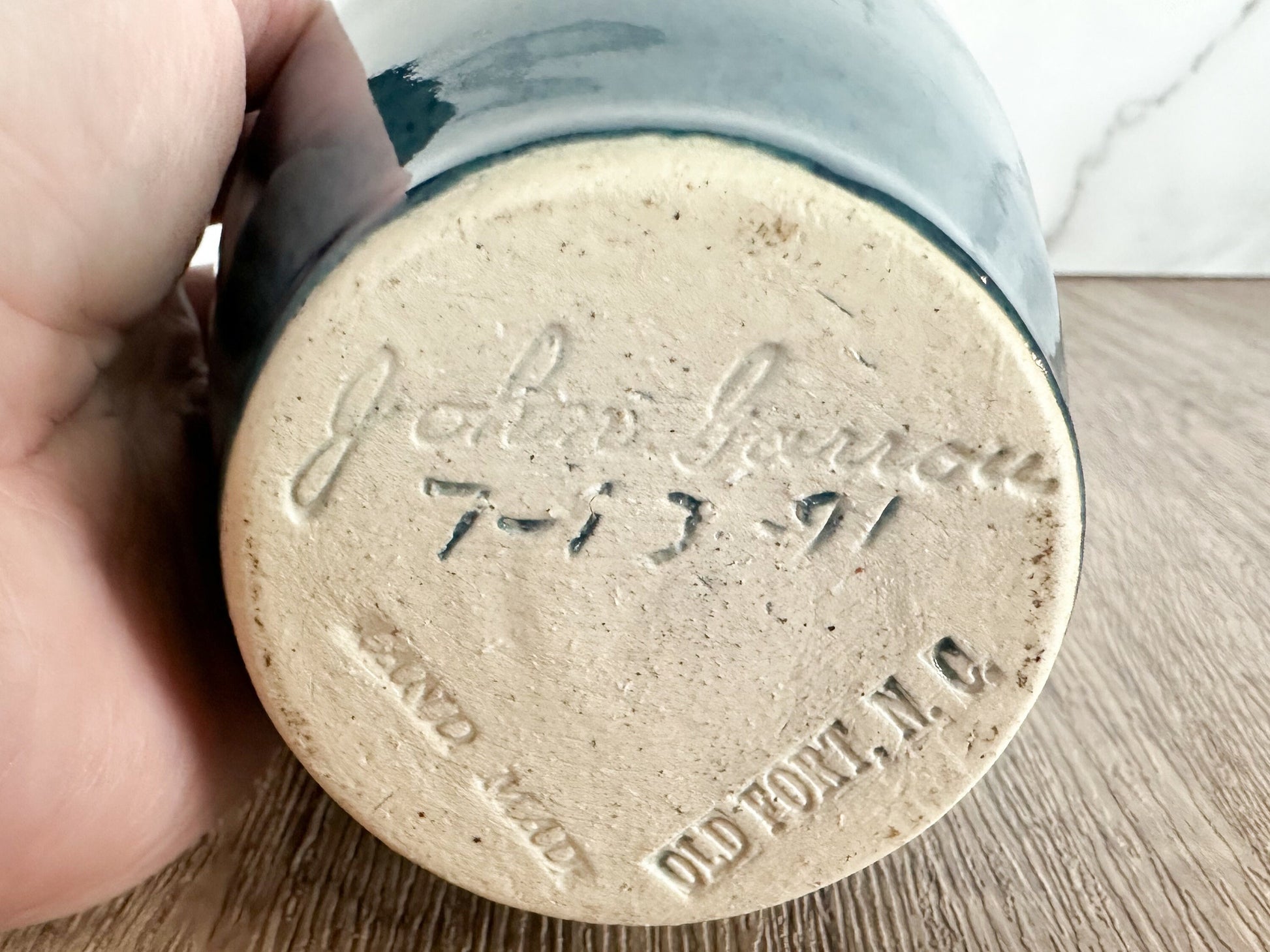Beautiful two tone blue glazed vintage stoneware pottery vase. Signed John Garrou, Old Fort NC. Measures about 6.5” tall and 3.5” at the widest.